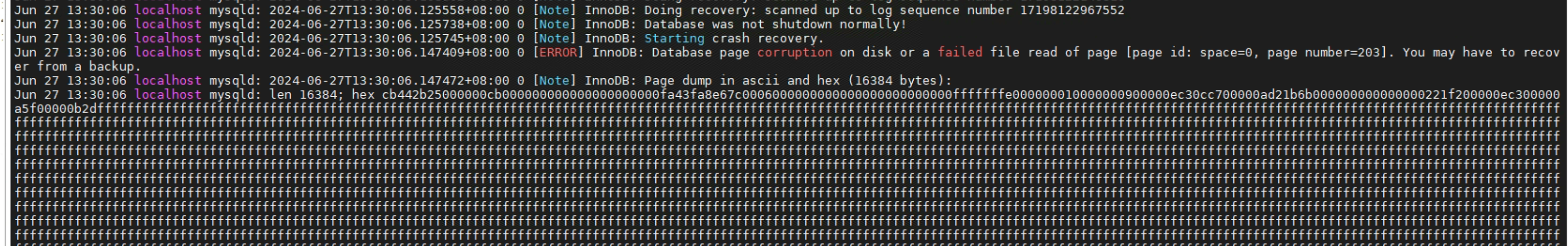 [ERROR] InnoDB: Database page corruption on disk or a failed file read of page [page id: space=0, page number=203]. You may have to recover from a backup. Jun 27 13:30:06 localhost mysqld: 2024-06-27T13:30:06.147472+08:00 0 [Note] InnoDB: Page dump in as