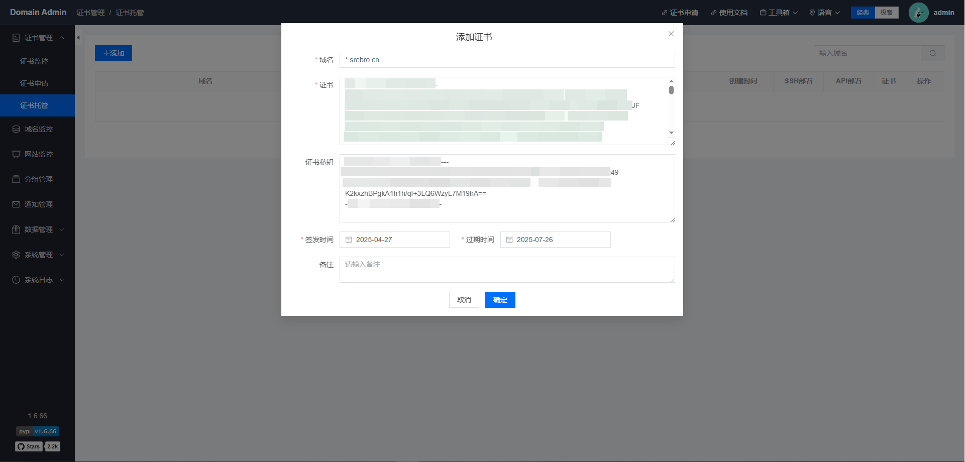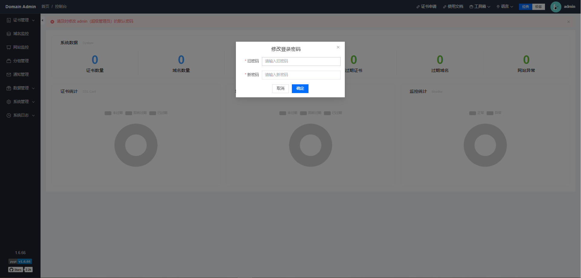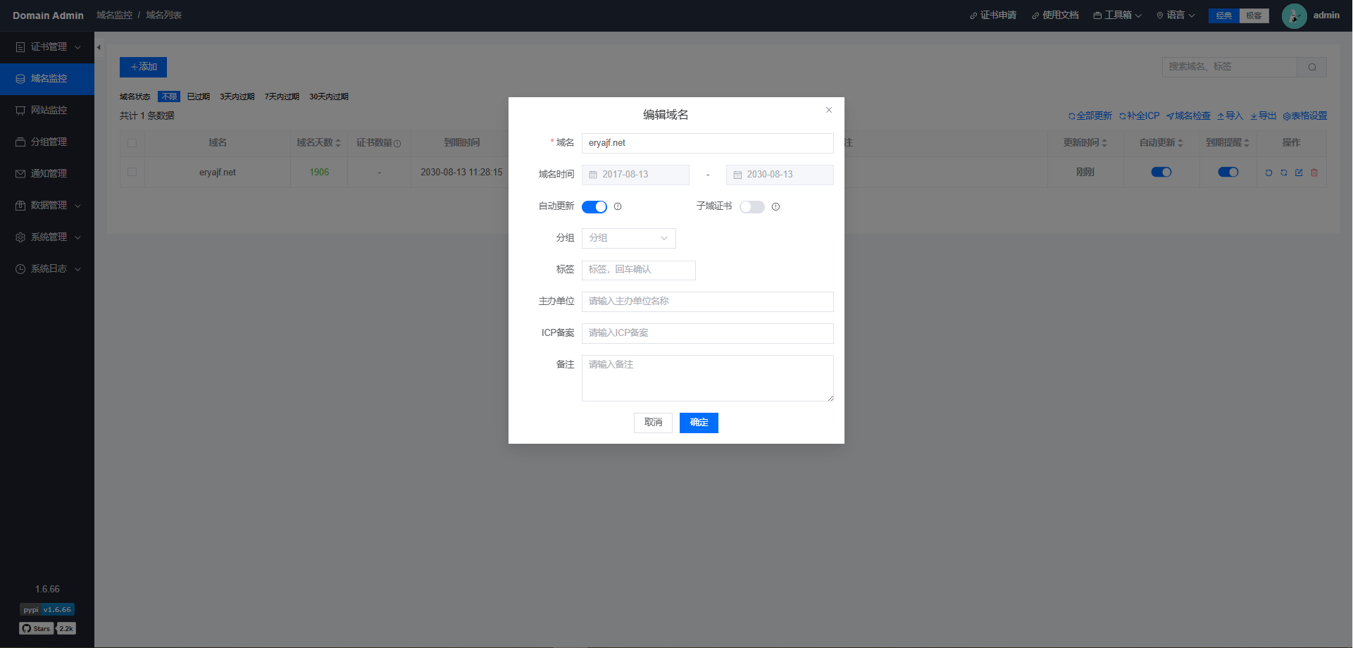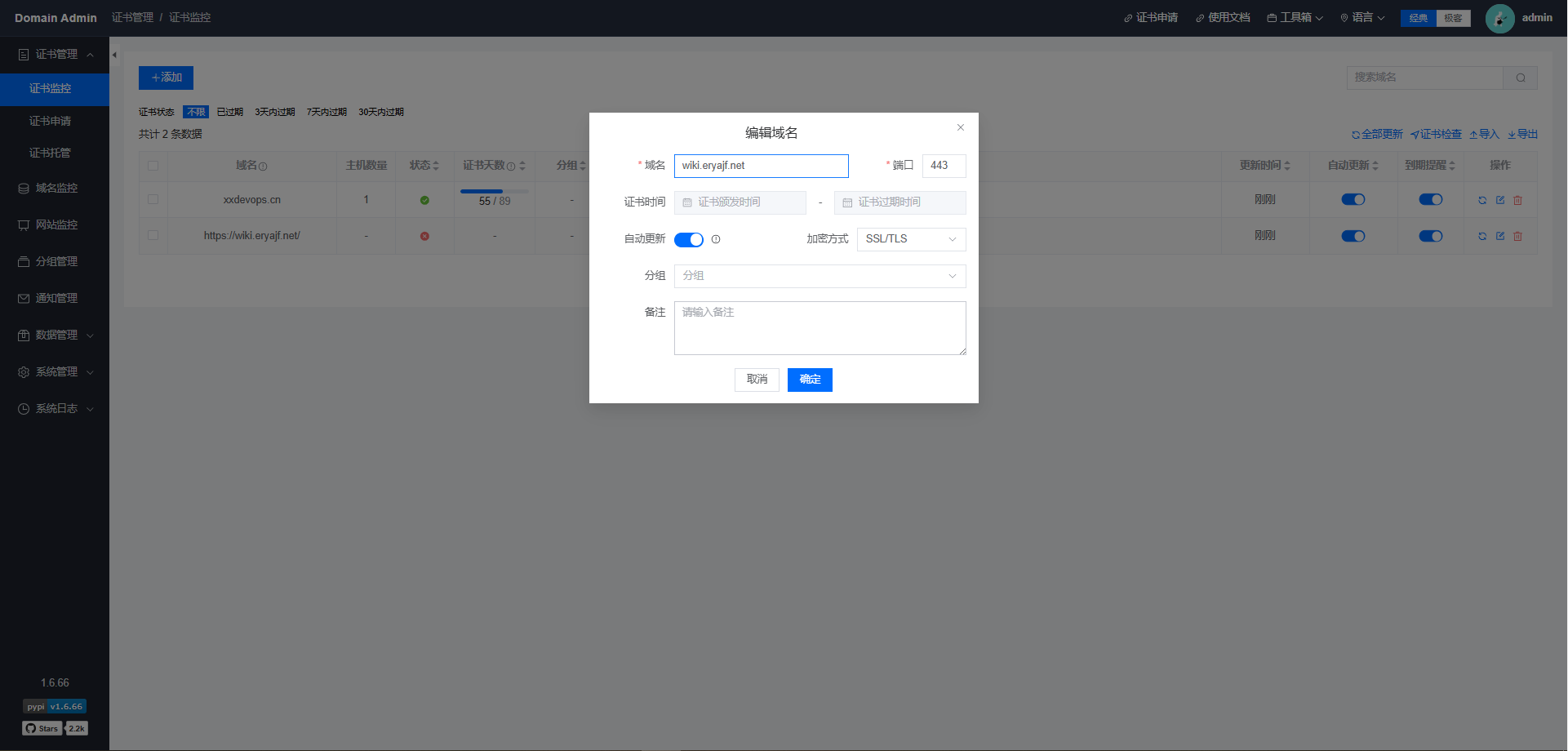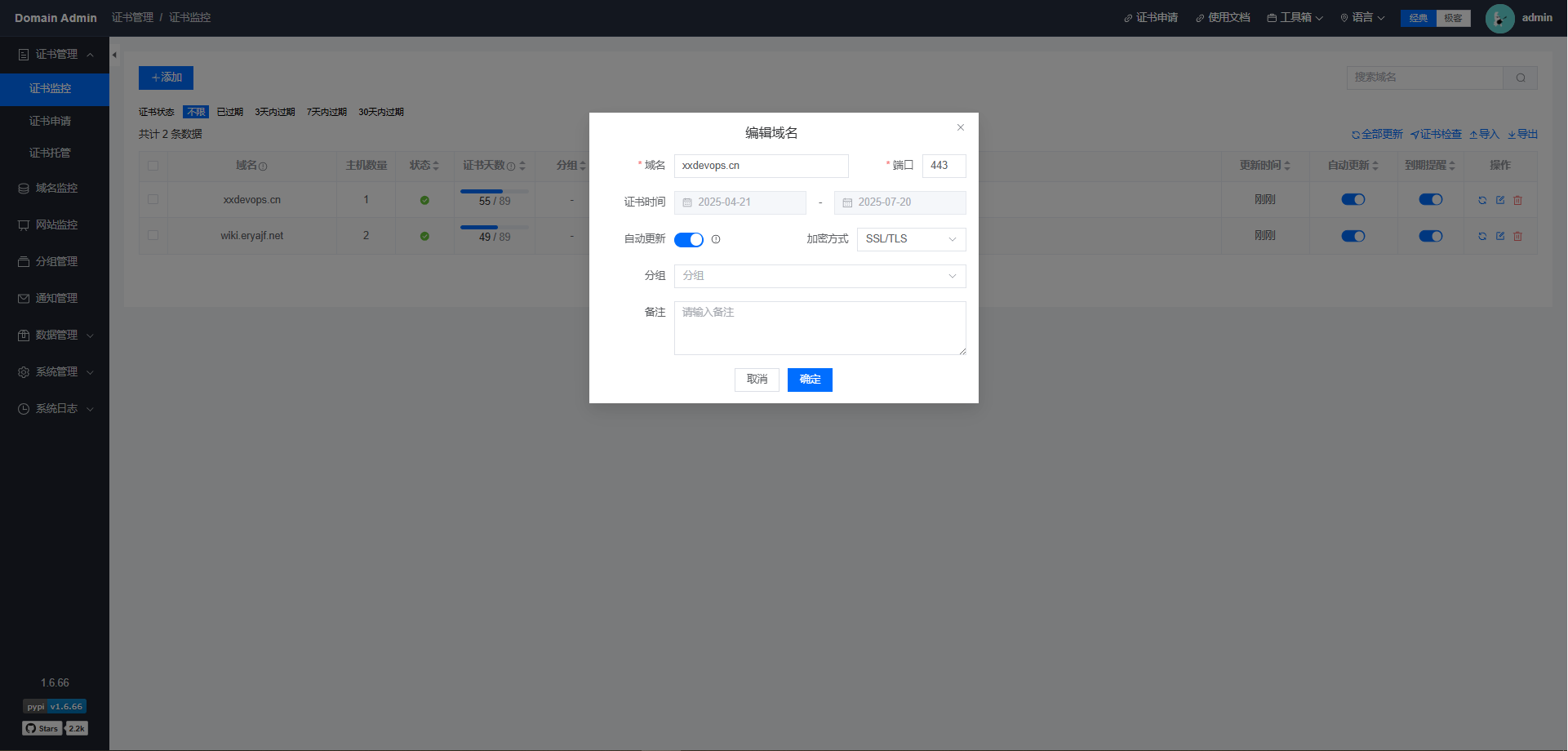 Domain Admin是一个基于Python + Vue3.js 技术栈实现的域名和SSL证书监测平台,支持申请证书,自动续签,到期提醒,支持独立部署 的一个轻量级监控方案,占用系统资源较少。
