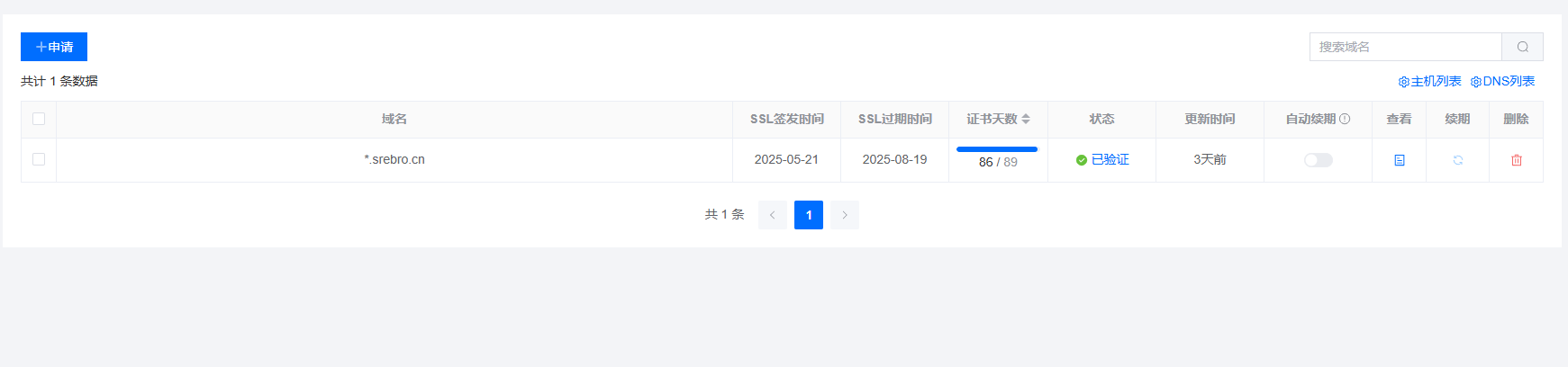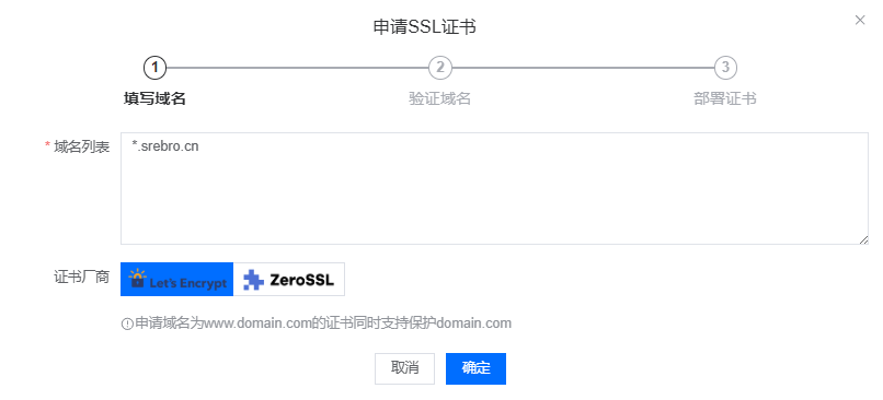 - 证书申请, 输入 域名列表,