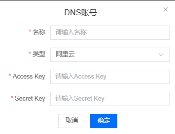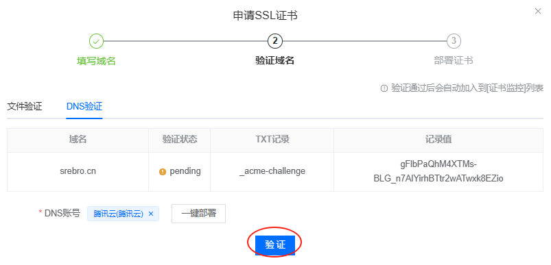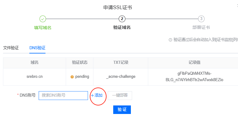 - 需要验证DNS 域名解析,这里支持添加DNS云厂商账户[阿里云,腾讯云],无需手动添加TXT解析记录