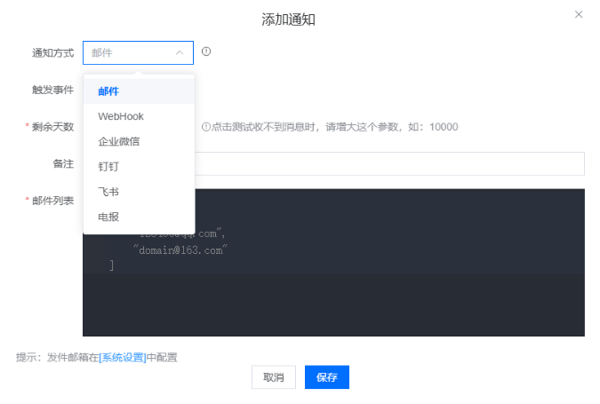 邮箱,WebHook,企业微信,钉钉,飞书,电报)